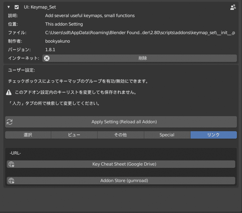 - - このアドオンの「辺」キーマップ設定の、シームを付ける(Ctrl + E)が競合している